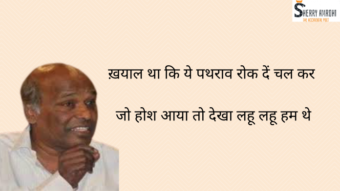 HomeA to Z Shayars A to Z ShayarsRahat Indori Ḳhayal Tha Ki Ye Pathrav Rok Den Chal Kar by Rahat Indori By Sherry Amrohi August 11, 2020 0 606 FacebookTwitterPinterestWhatsApp - Advertisement - Sad Shayari in Hindi ख़याल था कि ये पथराव रोक दें चल कर जो होश आया तो देखा लहू लहू हम थे Sad Shayari in English Ḳhayal Tha Ki Ye Pathrav Rok Den Chal Kar Jo Hosh Aaya To Dekha Lahu Lahu Ham The Share FacebookTwitterPinterestWhatsApp Previous articleRoz Patthar Ki Himayat Men Ġhazal Likhte Hain by Rahat IndoriNext articleHam Apni Jaan Ke Dushman Ko Apni Jaan Kahte Hain by Rahat Indori Sherry Amrohihttps://www.sherryamrohi.com Related Articles A to Z Shayars Tum jab aaogi to khoya hua paogi mujhe, Birthday Shayari Main likh du tumhari umar chand sitaro se Sharabi Shayari Kuch To Sharaphat Seekh Le Ishk Sharaab Se LEAVE A REPLY Cancel reply Comment: Please enter your comment! Name:* Please enter your name here Email:* You have entered an incorrect email address! Please enter your email address here Website: Save my name, email, and website in this browser for the next time I comment. Stay Connected0FansLike3,912FollowersFollow14,700SubscribersSubscribe - Advertisement - Latest Articles A to Z Shayars Tum jab aaogi to khoya hua paogi mujhe, Birthday Shayari Main likh du tumhari umar chand sitaro se Sharabi Shayari Kuch To Sharaphat Seekh Le Ishk Sharaab Se Romantic Shayari Khushiyaan kya hotee hamen nahin pata Yaad Shayari Jo Tune Diya Use Hum Yaad Karenge Load more