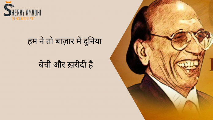 HomeA to Z Shayars A to Z ShayarsBashir Badr Ham Ne To Bazar Men Duniya Bechi Aur Ḳharidi Hai by Bashir Badr By Sherry Amrohi July 19, 2020 0 689 FacebookTwitterPinterestWhatsApp - Advertisement - Sad Shayari in Hindi हम ने तो बाज़ार में दुनिया बेची और ख़रीदी है हम को क्या मालूम किसी को कैसे चाहा जाता है Sad Shayari in English Ham Ne To Bazar Men Duniya Bechi Aur Ḳharidi Hai ham ko kyā ma.alūm kisī ko kaise chāhā jaatā hai Tagsbadr bashirbasheer badarbashir badrbashir badr ghazalsbashir badr kavita koshbashir badr on dostibashir badr poetrybashir badr poetry in urduchāhat shayaridr basheer badardr bashir badrdr bashir badr poetryduniyamausham shayarimohabbat shayaripoet bashir badrshayar bashir badr Share FacebookTwitterPinterestWhatsApp Previous articleUse Paak Nazron Se Chumna Bhi Ibadaton Men Shumar Hai by Bashir BadrNext articleBichhi Thiin Har Taraf Ankhen Hi Ankhen by Bashir Badr Sherry Amrohihttps://www.sherryamrohi.com Related Articles A to Z Shayars Tum jab aaogi to khoya hua paogi mujhe, Birthday Shayari Main likh du tumhari umar chand sitaro se Sharabi Shayari Kuch To Sharaphat Seekh Le Ishk Sharaab Se LEAVE A REPLY Cancel reply Comment: Please enter your comment! Name:* Please enter your name here Email:* You have entered an incorrect email address! Please enter your email address here Website: Save my name, email, and website in this browser for the next time I comment. Stay Connected0FansLike3,912FollowersFollow14,700SubscribersSubscribe - Advertisement - Latest Articles A to Z Shayars Tum jab aaogi to khoya hua paogi mujhe, Birthday Shayari Main likh du tumhari umar chand sitaro se Sharabi Shayari Kuch To Sharaphat Seekh Le Ishk Sharaab Se Romantic Shayari Khushiyaan kya hotee hamen nahin pata Yaad Shayari Jo Tune Diya Use Hum Yaad Karenge Load more