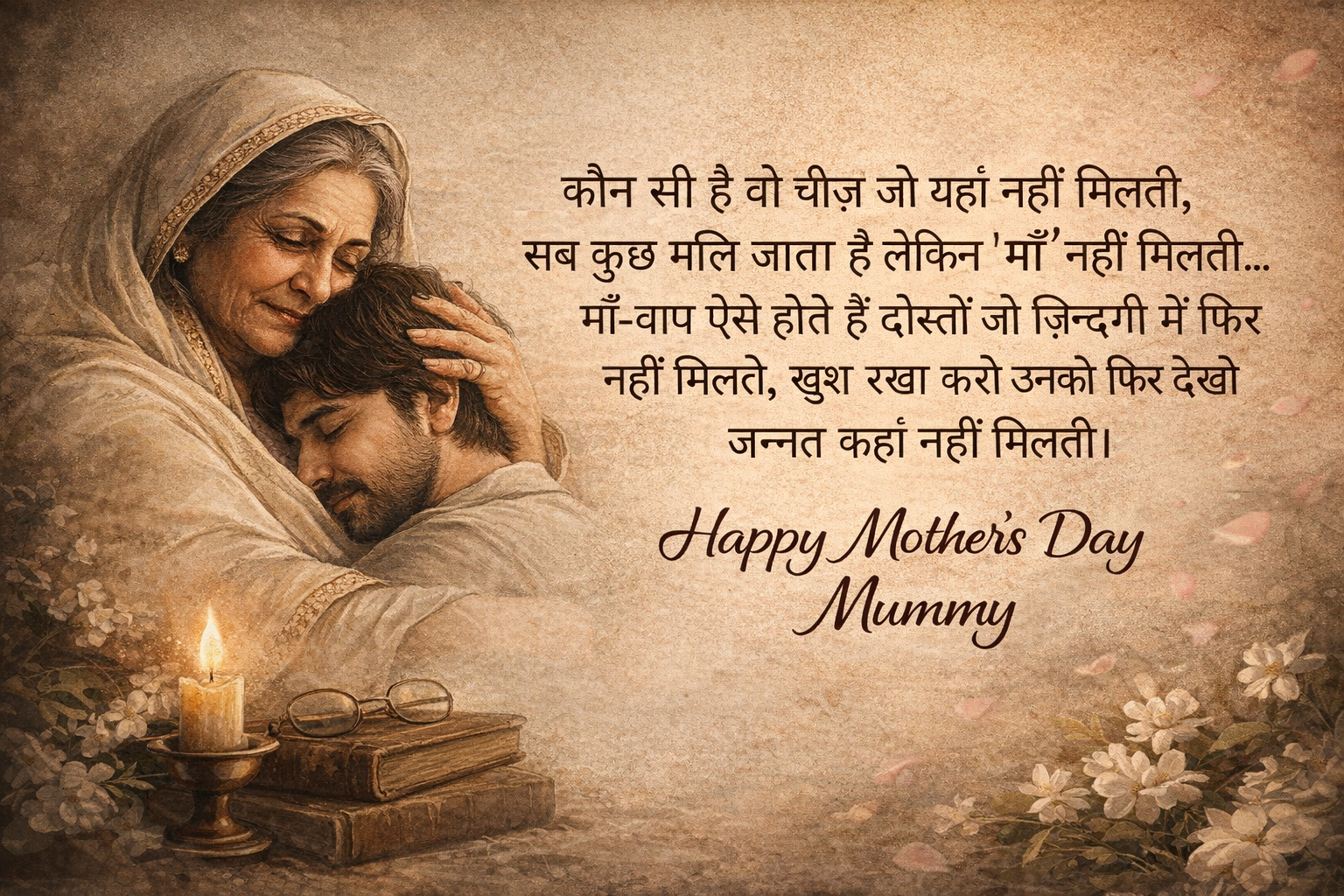 kaun see hai vo cheez jo yahaan nahin milatee, sab kuchh mil jaata hai lekin “maan” nahin milatee… maan-baap aise hote hain doston jo zindagee mein phir nahin milate, khush rakha karo unako phir dekho jannat kahaan nahin milatee. happy mothairs day mummy