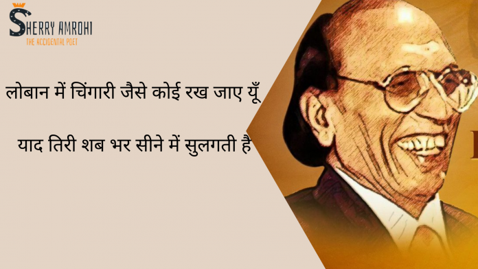 HomeA to Z Shayars A to Z ShayarsBashir Badr Loban Men Chingari Jaise Koi Rakh Jaae by Bashir Badr By Sherry Amrohi July 22, 2020 0 353 FacebookTwitterPinterestWhatsApp - Advertisement - Yaad Shayari in Hindi लोबान में चिंगारी जैसे कोई रख जाए यूँ याद तिरी शब भर सीने में सुलगती है Yaad Shayari in English Loban Men Chingari Jaise Koi Rakh Jaae yuuñ yaad tirī shab bhar siine meñ sulagtī hai Tagsbadr bashirbasheer badarbashir badrbashir badr ghazalsbashir badr kavita koshbashir badr on dostibashir badr poetrybashir badr poetry in urduChingaridr basheer badardr bashir badrdr bashir badr poetrymausham shayarimohabbat shayaripoet bashir badrshayar bashir badryaad shayari Share FacebookTwitterPinterestWhatsApp Previous articleKar Har Maidaan Fateh Lyrics In Hindi/EnglishNext articleBahut Dinon Se Hai Dil Apna Ḳhali Ḳhali Sa by Bashir Badr Sherry Amrohihttps://www.sherryamrohi.com Related Articles A to Z Shayars Tum jab aaogi to khoya hua paogi mujhe, Birthday Shayari Main likh du tumhari umar chand sitaro se Sharabi Shayari Kuch To Sharaphat Seekh Le Ishk Sharaab Se LEAVE A REPLY Cancel reply Comment: Please enter your comment! Name:* Please enter your name here Email:* You have entered an incorrect email address! Please enter your email address here Website: Save my name, email, and website in this browser for the next time I comment. Stay Connected0FansLike3,912FollowersFollow14,700SubscribersSubscribe - Advertisement - Latest Articles A to Z Shayars Tum jab aaogi to khoya hua paogi mujhe, Birthday Shayari Main likh du tumhari umar chand sitaro se Sharabi Shayari Kuch To Sharaphat Seekh Le Ishk Sharaab Se Romantic Shayari Khushiyaan kya hotee hamen nahin pata Yaad Shayari Jo Tune Diya Use Hum Yaad Karenge Load more
