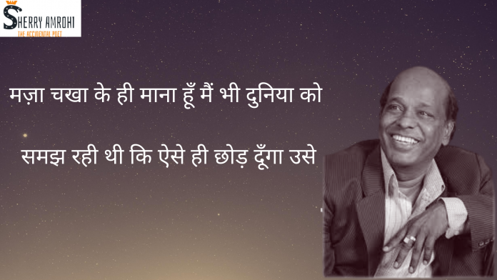 HomeA to Z Shayars A to Z ShayarsRahat Indori Maza Chakha Ke Hi Maana Huun Main Bhi Duniya Ko by Rahat Indori By Sherry Amrohi August 11, 2020 0 336 FacebookTwitterPinterestWhatsApp - Advertisement - Sad Shayari in Hindi मज़ा चखा के ही माना हूँ मैं भी दुनिया को समझ रही थी कि ऐसे ही छोड़ दूँगा उसे Sad Shayari in English Maza Chakha Ke Hi Maana Huun Main Bhi Duniya Ko Samajh Rahi Thi Ki Aise Hi Chhoḍ Dunga Use Share FacebookTwitterPinterestWhatsApp Previous articleSuraj Sitare Chand Mire Saat Men Rahe by Rahat IndoriNext articleMain Aa Kar Dushmanon Men Bas Gaya Huun by Rahat Indori Sherry Amrohihttps://www.sherryamrohi.com Related Articles A to Z Shayars Tum jab aaogi to khoya hua paogi mujhe, Birthday Shayari Main likh du tumhari umar chand sitaro se Sharabi Shayari Kuch To Sharaphat Seekh Le Ishk Sharaab Se LEAVE A REPLY Cancel reply Comment: Please enter your comment! Name:* Please enter your name here Email:* You have entered an incorrect email address! Please enter your email address here Website: Save my name, email, and website in this browser for the next time I comment. Stay Connected0FansLike3,912FollowersFollow14,700SubscribersSubscribe - Advertisement - Latest Articles A to Z Shayars Tum jab aaogi to khoya hua paogi mujhe, Birthday Shayari Main likh du tumhari umar chand sitaro se Sharabi Shayari Kuch To Sharaphat Seekh Le Ishk Sharaab Se Romantic Shayari Khushiyaan kya hotee hamen nahin pata Yaad Shayari Jo Tune Diya Use Hum Yaad Karenge Load more