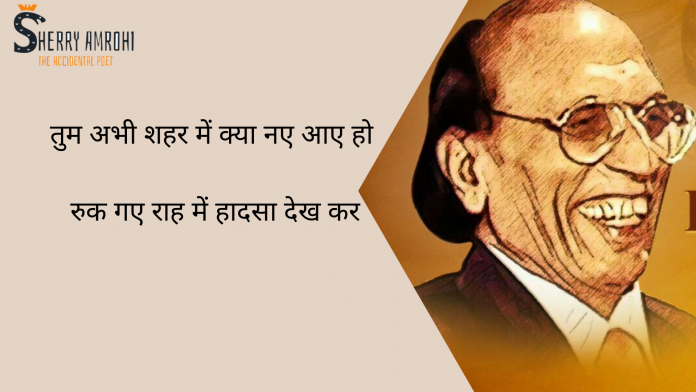 HomeA to Z Shayars A to Z ShayarsBashir Badr Tum Abhi Shahr Men Kya Nae Aae Ho by Bashir Badr By Sherry Amrohi July 17, 2020 0 265 FacebookTwitterPinterestWhatsApp - Advertisement - Sad Shayari in Hindi तुम अभी शहर में क्या नए आए हो रुक गए राह में हादसा देख कर Sad Shayari in English tum abhi shahr men kya nae aae ho ruk ga.e raah meñ hādsa dekh kar Tagsbadr bashirbasheer badarbashir badrbashir badr ghazalsbashir badr kavita koshbashir badr on dostibashir badr poetrybashir badr poetry in urdudr basheer badardr bashir badrdr bashir badr poetryHadsamausham shayarimohabbat shayaripoet bashir badrSaharshayar bashir badr Share FacebookTwitterPinterestWhatsApp Previous articleMain Har Haal Men Muskurata Rahnga by Bashir BadrNext articleSwag Se Swagat Lyrics In Hindi/English Sherry Amrohihttps://www.sherryamrohi.com Related Articles A to Z Shayars Tum jab aaogi to khoya hua paogi mujhe, Birthday Shayari Main likh du tumhari umar chand sitaro se Sharabi Shayari Kuch To Sharaphat Seekh Le Ishk Sharaab Se LEAVE A REPLY Cancel reply Comment: Please enter your comment! Name:* Please enter your name here Email:* You have entered an incorrect email address! Please enter your email address here Website: Save my name, email, and website in this browser for the next time I comment. Stay Connected0FansLike3,912FollowersFollow14,700SubscribersSubscribe - Advertisement - Latest Articles A to Z Shayars Tum jab aaogi to khoya hua paogi mujhe, Birthday Shayari Main likh du tumhari umar chand sitaro se Sharabi Shayari Kuch To Sharaphat Seekh Le Ishk Sharaab Se Romantic Shayari Khushiyaan kya hotee hamen nahin pata Yaad Shayari Jo Tune Diya Use Hum Yaad Karenge Load more